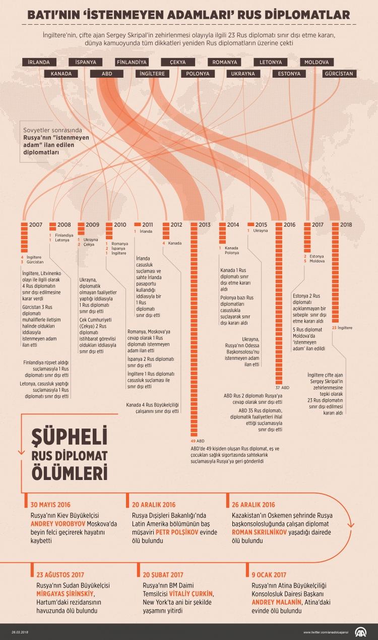 Eski Rus ajan Sergey Skripal’in İngiltere’de sinir gazıyla zehirlenmesinin ardından başlayan diplomatik kriz büyüyor. ABD ve 14 AB üyesi ülke, Rus diplomatları sınırdışı etme kararı aldı.