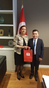 Arda Gül ve ailesi ile sohbet ederek dersleri ve gelecek planları hakkında bilgi alan Dilşad Kırbaşlı Karaoğlu, öğrencimize Başkonsolosluğun yaptırdığı hediyelik ürünlerden ve Türkçe kitap hediye etti.
