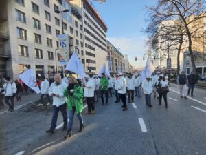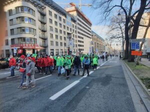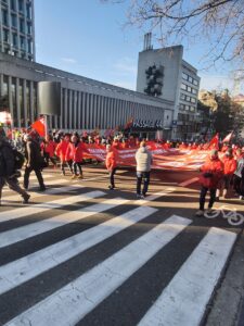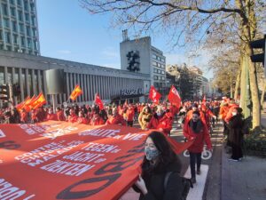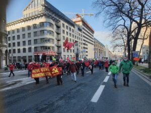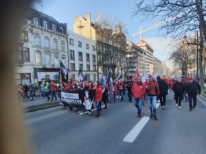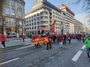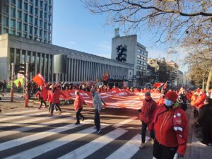 Ülkenin farklı kentlerinden gelen işçiler, Brüksel’deki Kuzey Tren İstasyonu önünde toplanarak Merkez İstasyona yürüdü. Yeşil ve kırmızı şapkalar, maskeler ve montlar giyerek sendikalarını temsil eden flamalarla trafiğe kapatılan geniş caddelerde yürüyen göstericiler,