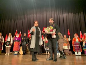 Dernek Başkanı Av. Ahmet Doğanses, program sonunda tiyatro oyununun yönetmeni Hafize Erdoğan’a plaket ve çiçek buketi takdim etti.