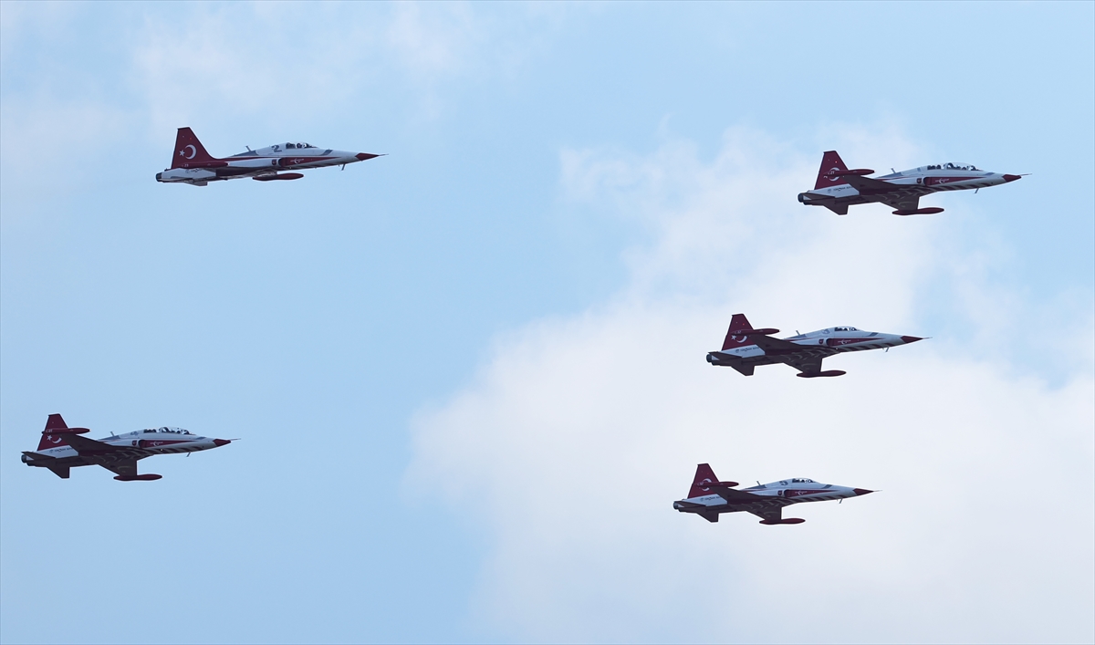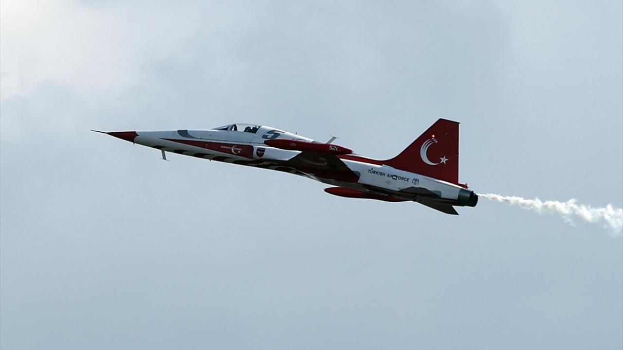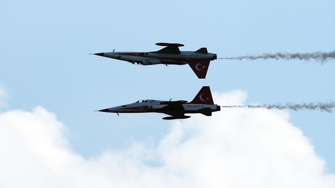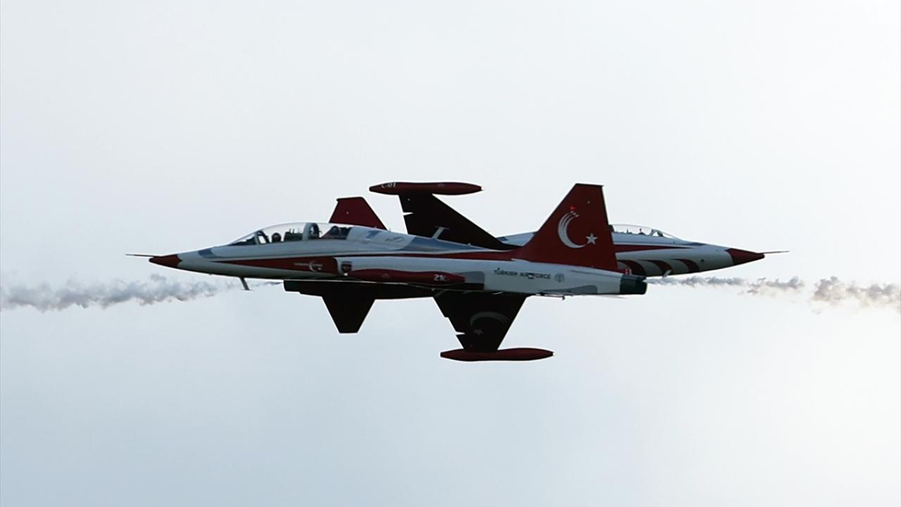 Toplam 6 adet F-5 tipi uçaktan oluşan ve Kleine-Brogel Hava Üssü`nden kalkarak gösteri alanının üzerine gelen Türk Yıldızları`nın gösterisi yaklaşık 30 dakika sürdü.