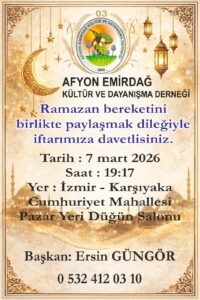 Dernek yönetimi, “Birlikte rahmet, ayrılıkta azap vardır” düsturuyla İzmir’deki Afyon Emirdağlılar ailesini bu müstesna buluşmada bir araya gelmeye davet ederken, Ramazan-ı Şerif’in tüm İslam âlemine hayırlar getirmesi temennisinde bulundu.