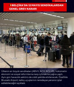 Belçika’da 12 Mayıs Salı günü ülke genelinde büyük bir grev dalgası geliyor. Ülkenin en büyük sendikaları (ABVV, ACV, ACLVB), hükümetin ekonomi ve sosyal reformlarına karşı iş bırakma çağrısı yaptı.